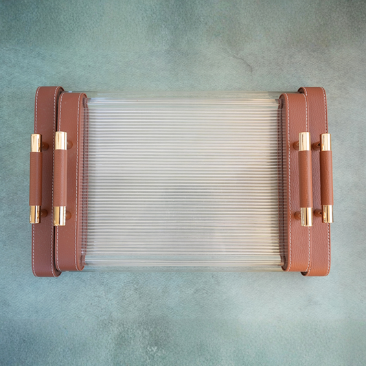 Ribbed Acrylic and Tan PU Leather Serving Tray- Set of 2