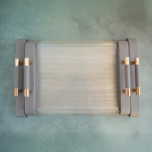 Ribbed Acrylic and Gray PU Leather Serving Tray- Set of 2