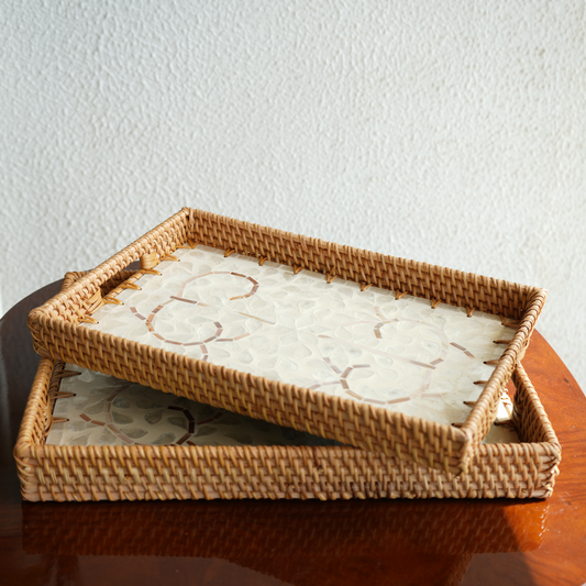 Regular Rectangular Mother-of-Pearl & Cane Serving Tray - Pearl White