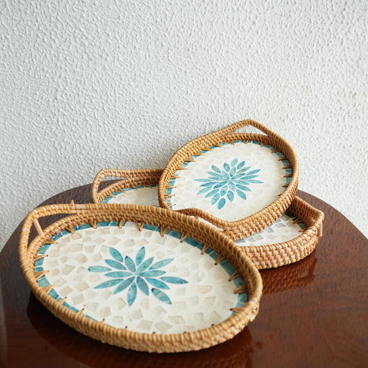 Small Oval Mother-of-Pearl & Cane Serving Tray- Aqua
