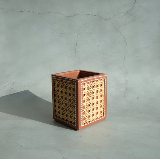 Tan Brown PU Leather & Rattan Stationery Holder