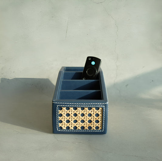 Steel Blue PU Leather & Rattan Remote Control Organiser