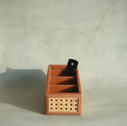 Tan Brown PU Leather & Rattan Remote Control Organiser