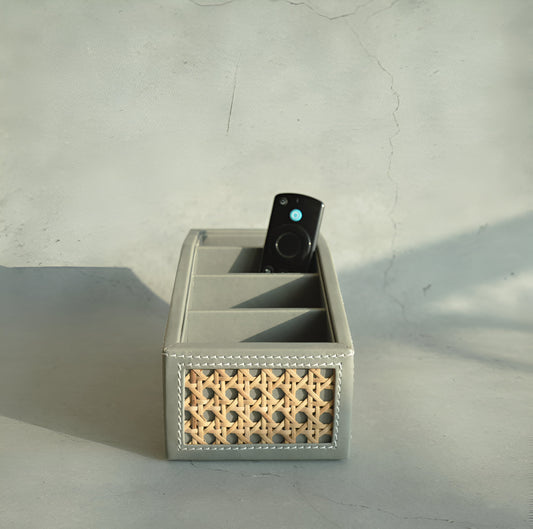 Stone Gray PU Leather & Rattan Remote Control Organiser