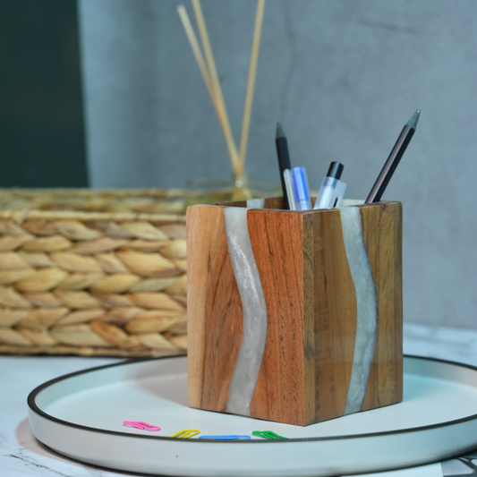Pearl White Resin and Wooden Stationery Holder