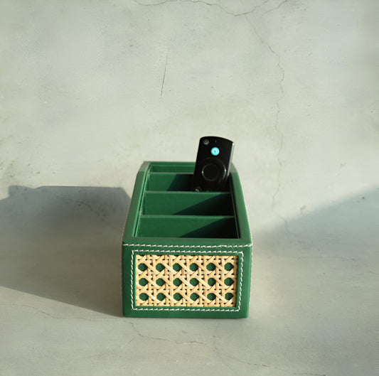 Emerald Green PU Leather & Rattan Remote Control Organiser