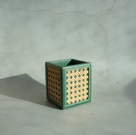 Emerald Green PU Leather & Rattan Stationery Holder