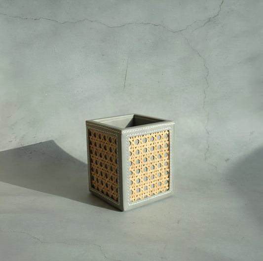Stone Gray PU Leather & Rattan Stationery Holder