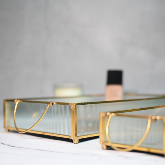 Ribbed Serving Tray with Gold Rim and Handles- Set of 3