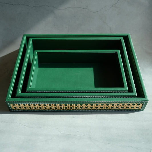 Emerald Green PU Leather & Rattan Serving Tray - Medium