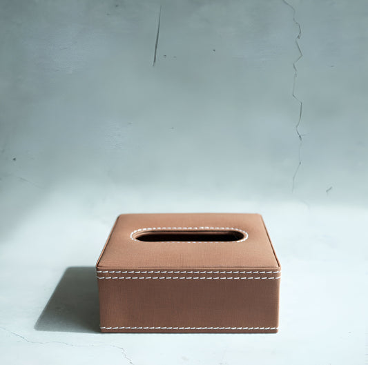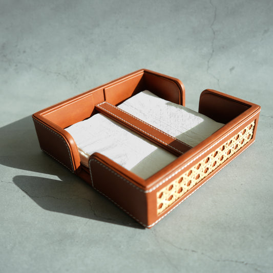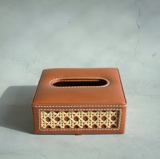 Tan Brown PU Leather & Rattan Tissue Box - Square