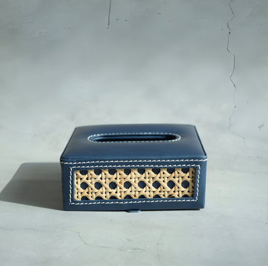 Steel Blue PU Leather & Rattan Tissue Box - Square