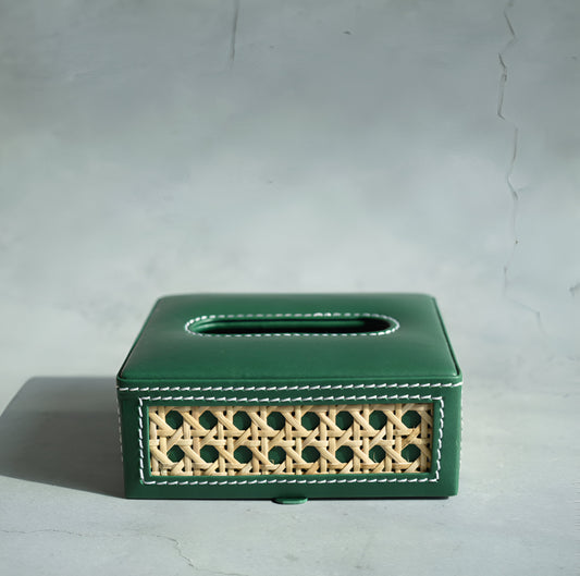 Emerald Green PU Leather & Rattan Tissue Box - Square
