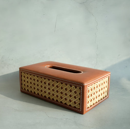 Tan Brown PU Leather & Rattan Tissue Box - Rectangle