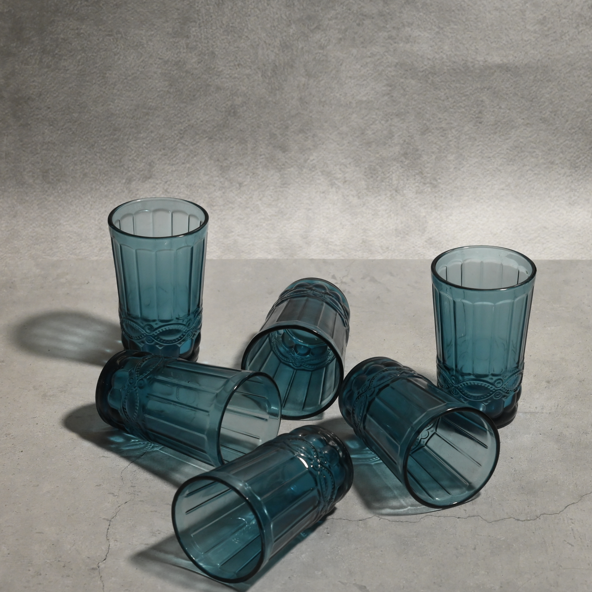 Enhance your table setting with our Blue Tinted Textured Glass, available as a set of 6. Featuring a subtle blue tint and elegant textured finish, these glasses add a touch of sophistication to your serveware, perfect for both everyday use and special occasions, making every sip stylish.
