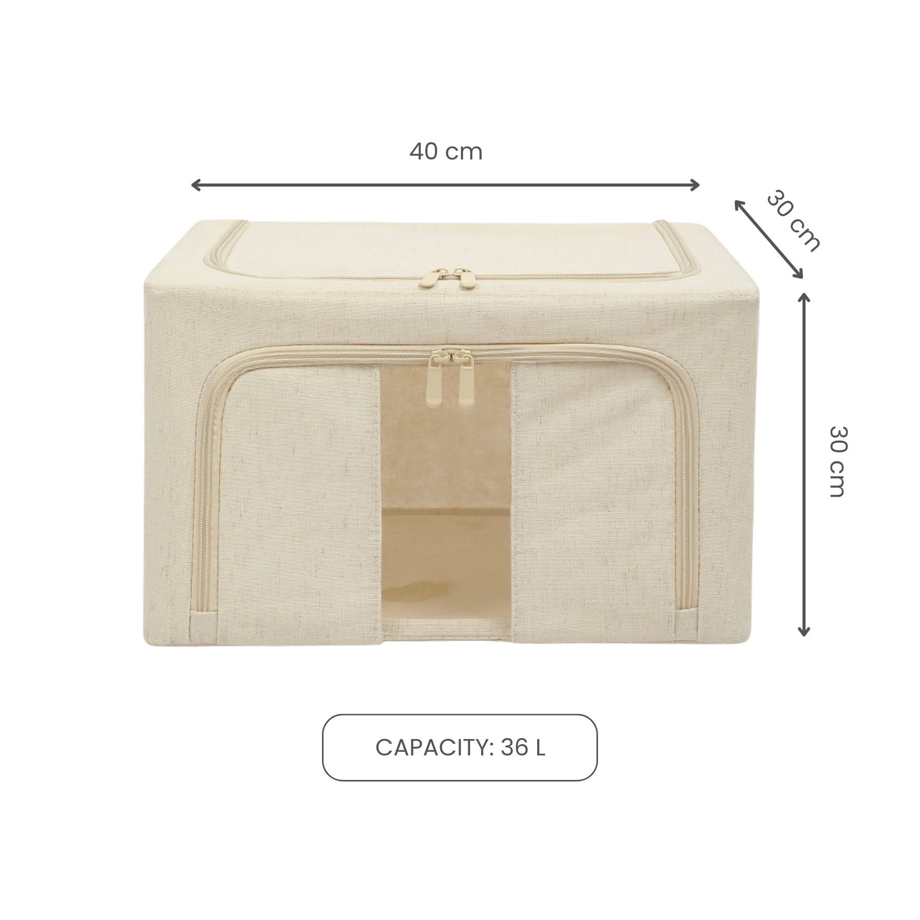 Organise effortlessly with our 36L Collapsible Storage Bin, crafted from durable cotton-hemp fabric with a powder-coated steel frame for sturdy support. The transparent window lets you easily view stored items, while its foldable design ensures space-saving convenience. Perfect for decluttering closets, shelves, or under-bed storage, this bin blends functionality with style.