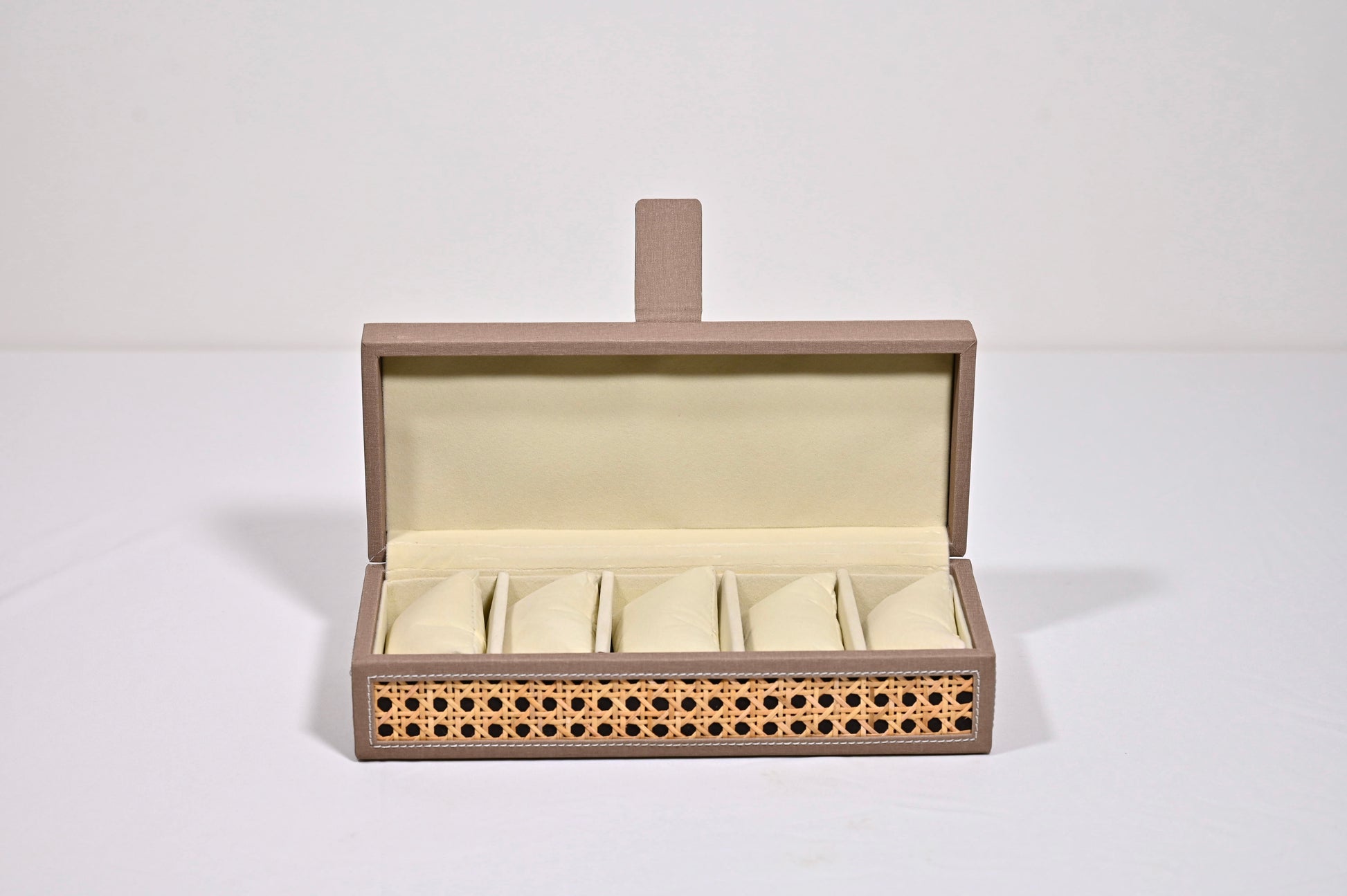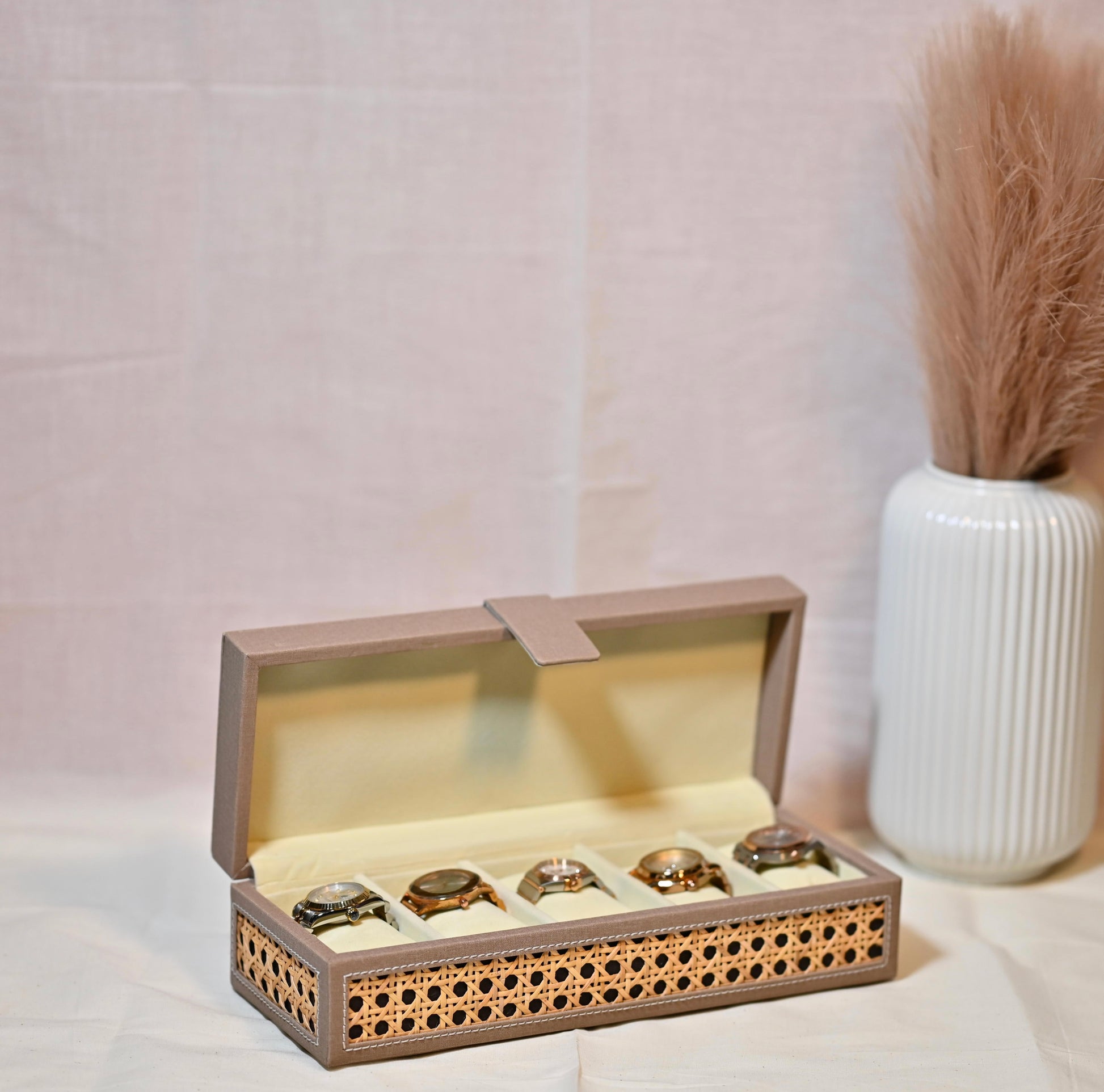 The Rattan Watch Organizer combines sophisticated design with practical functionality. Crafted from durable rattan this organizer features 5 slots to keep your watches and accessories neatly arranged and easily accessible. Perfect for adding a touch of elegance to your dressing table or nightstand.