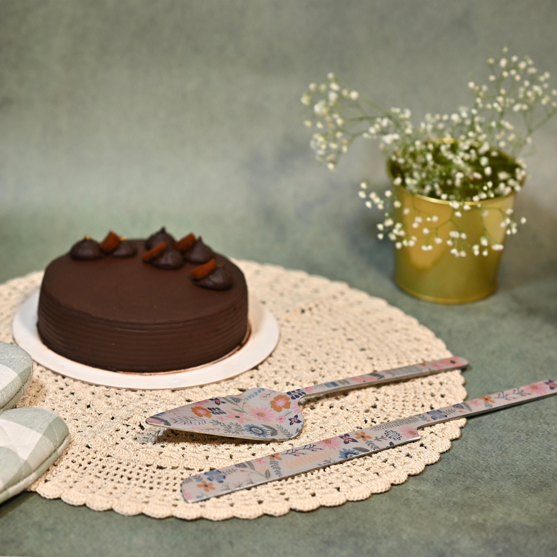 The Floral Print Cake Lifter and Knife Set adds a touch of charm to any dessert presentation. Featuring a beautifully designed floral print, the set includes a sharp knife for precise slicing and a wide lifter for easy serving. Perfect for special occasions or everyday use, this set combines functionality with a delightful aesthetic.