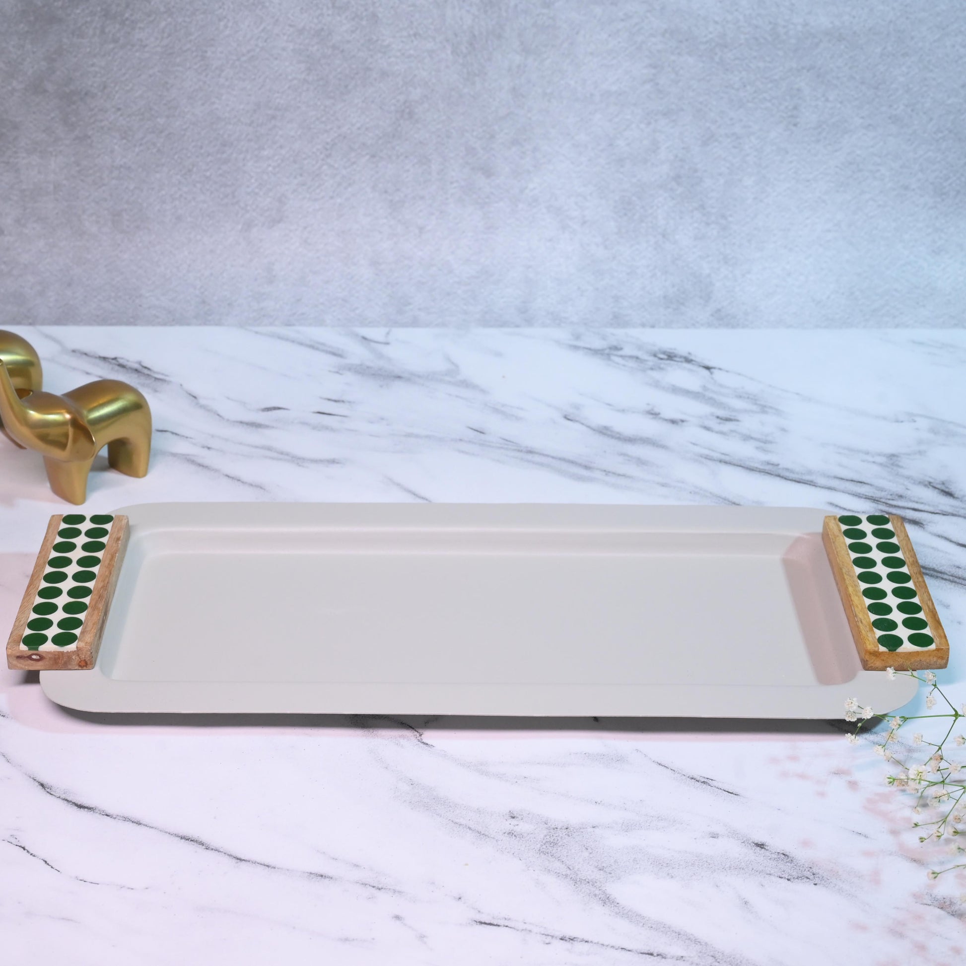 Serve in style with our Geometric Metal Serving Tray, crafted from metal and wood in an elegant jade green hue. Featuring a sleek geometric design, this versatile tray is perfect for presenting drinks, snacks, or desserts, adding a modern and sophisticated touch to any occasion.