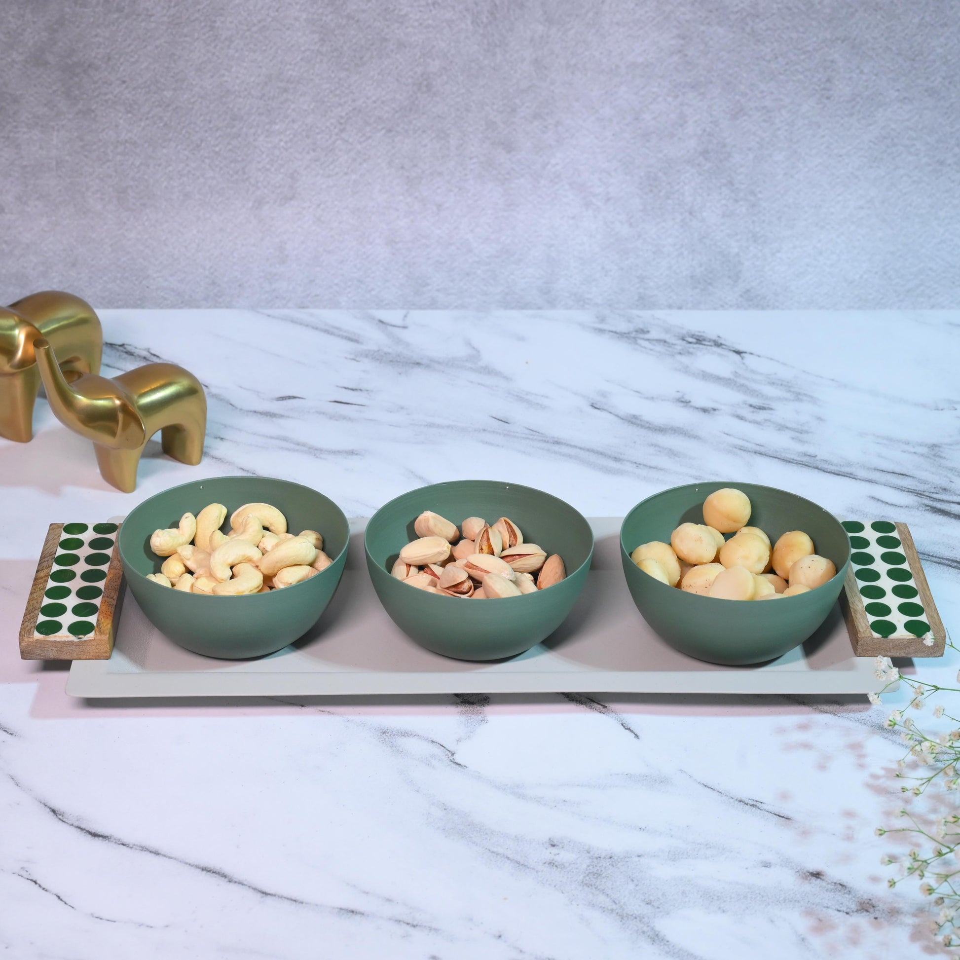 Serve with elegance using our Geometric Metal Tray Set with 3 Serving Bowls, crafted from metal and wood in a sophisticated jade green hue. Featuring a sleek geometric design, this versatile set is perfect for presenting snacks, dips, or desserts, adding a modern and stylish touch to any dining experience.