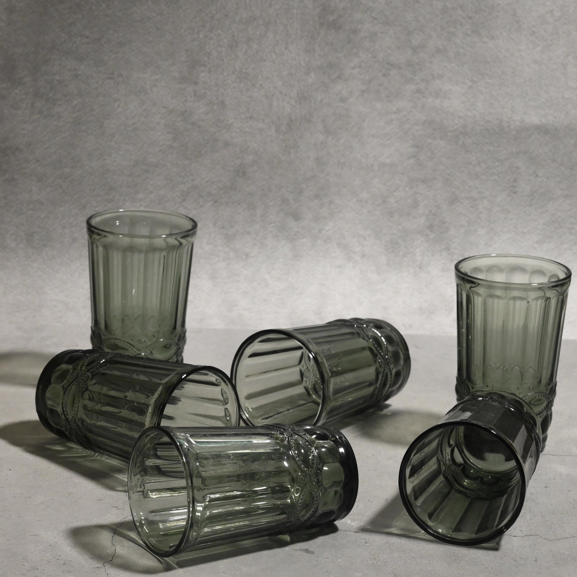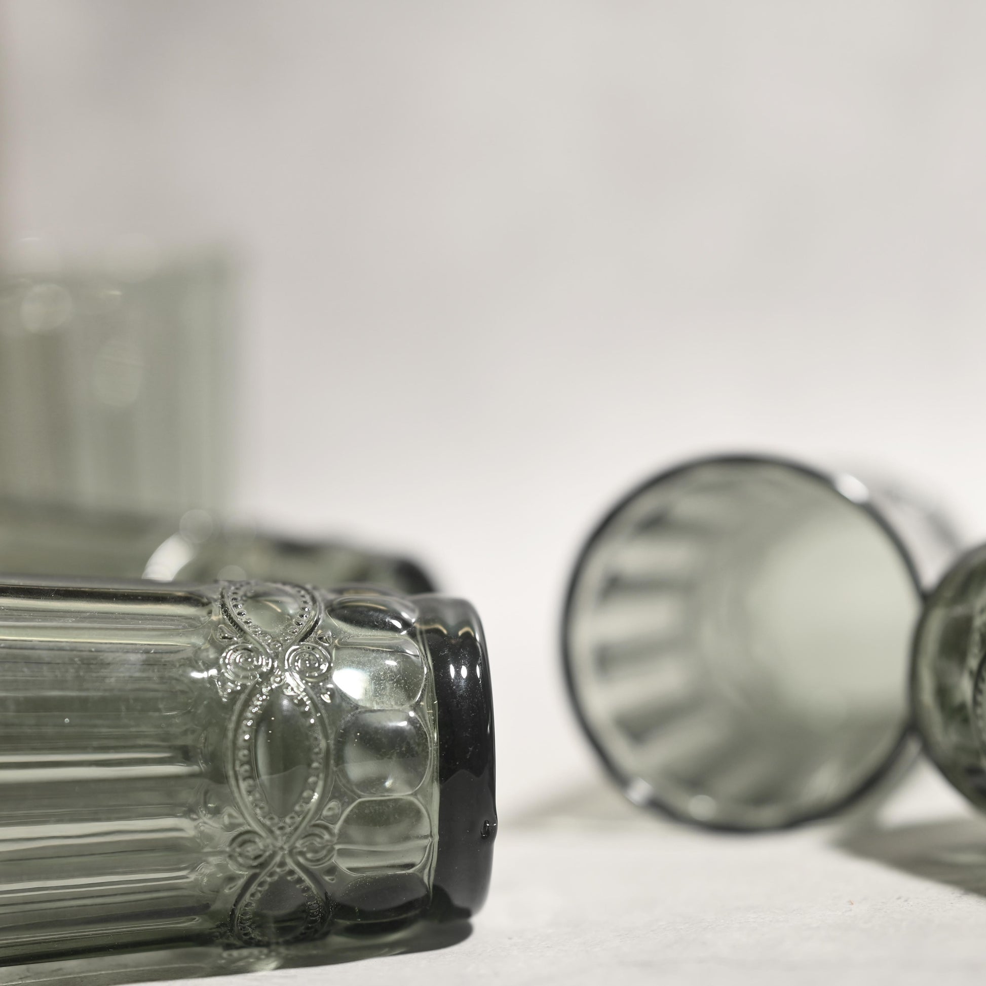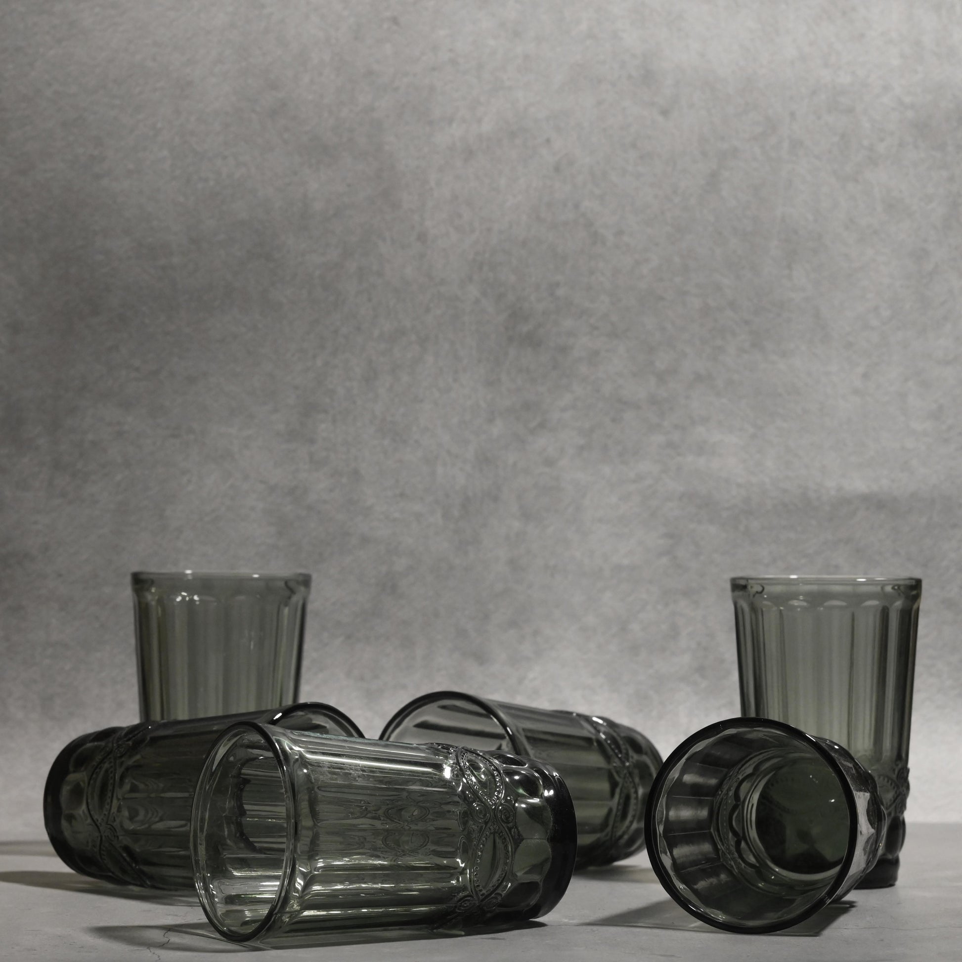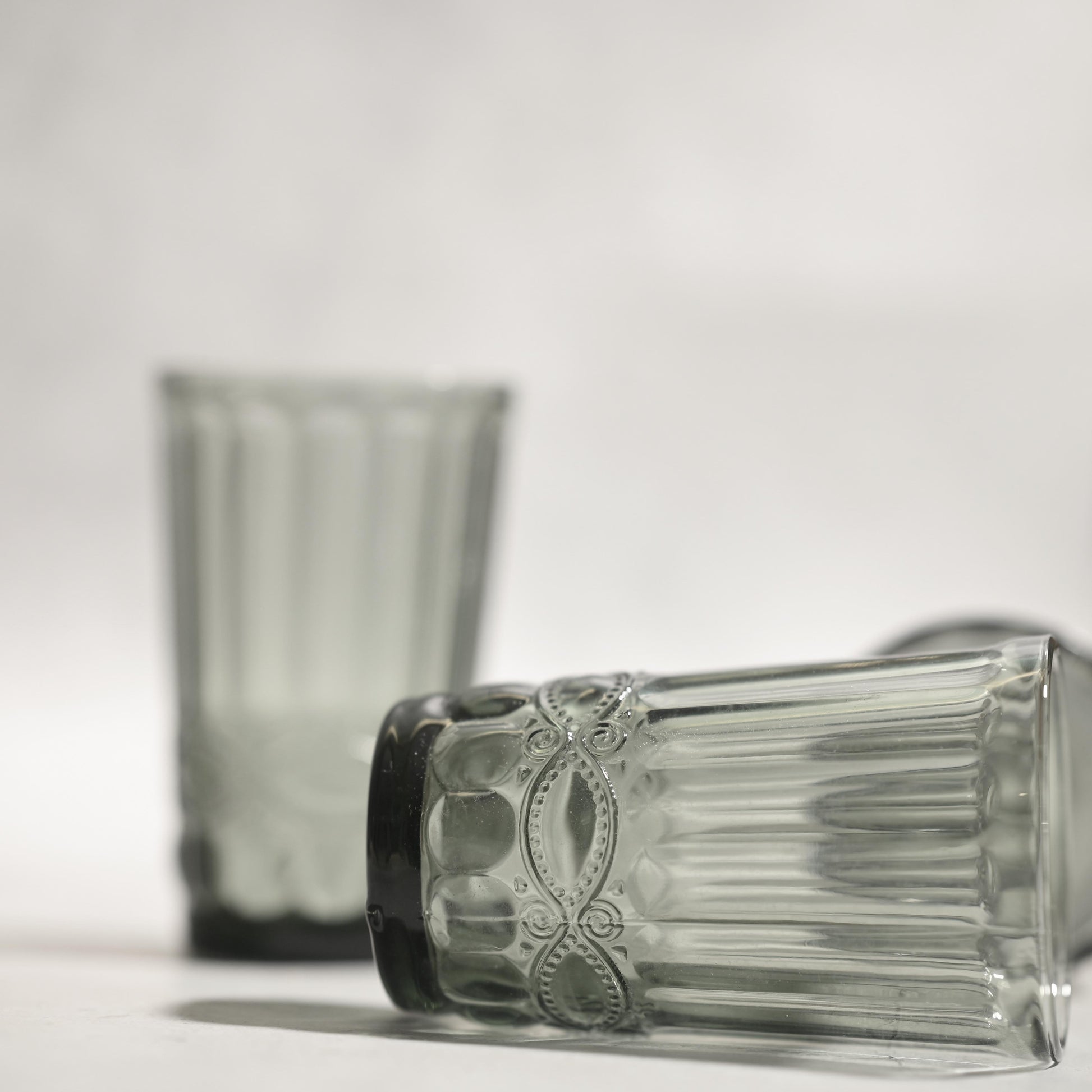 Enhance your table setting with our Gray Tinted Textured Glass, available as a set of 6. Featuring a subtle gray tint and elegant textured finish, these glasses add a touch of sophistication to your serveware, perfect for both everyday use and special occasions, making every sip stylish.