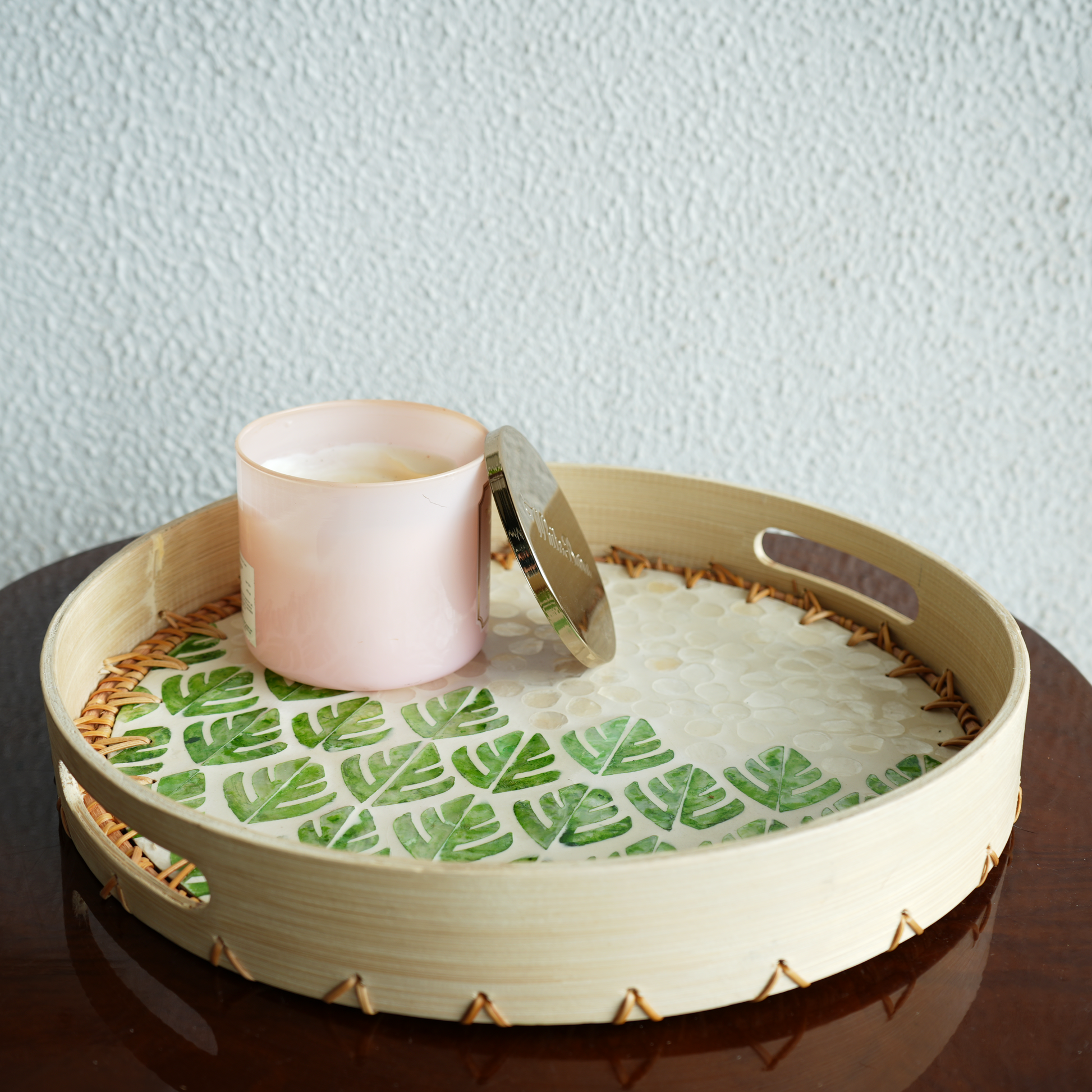 Large Round Mother-of-Pearl & Cane Serving Tray - Botanic