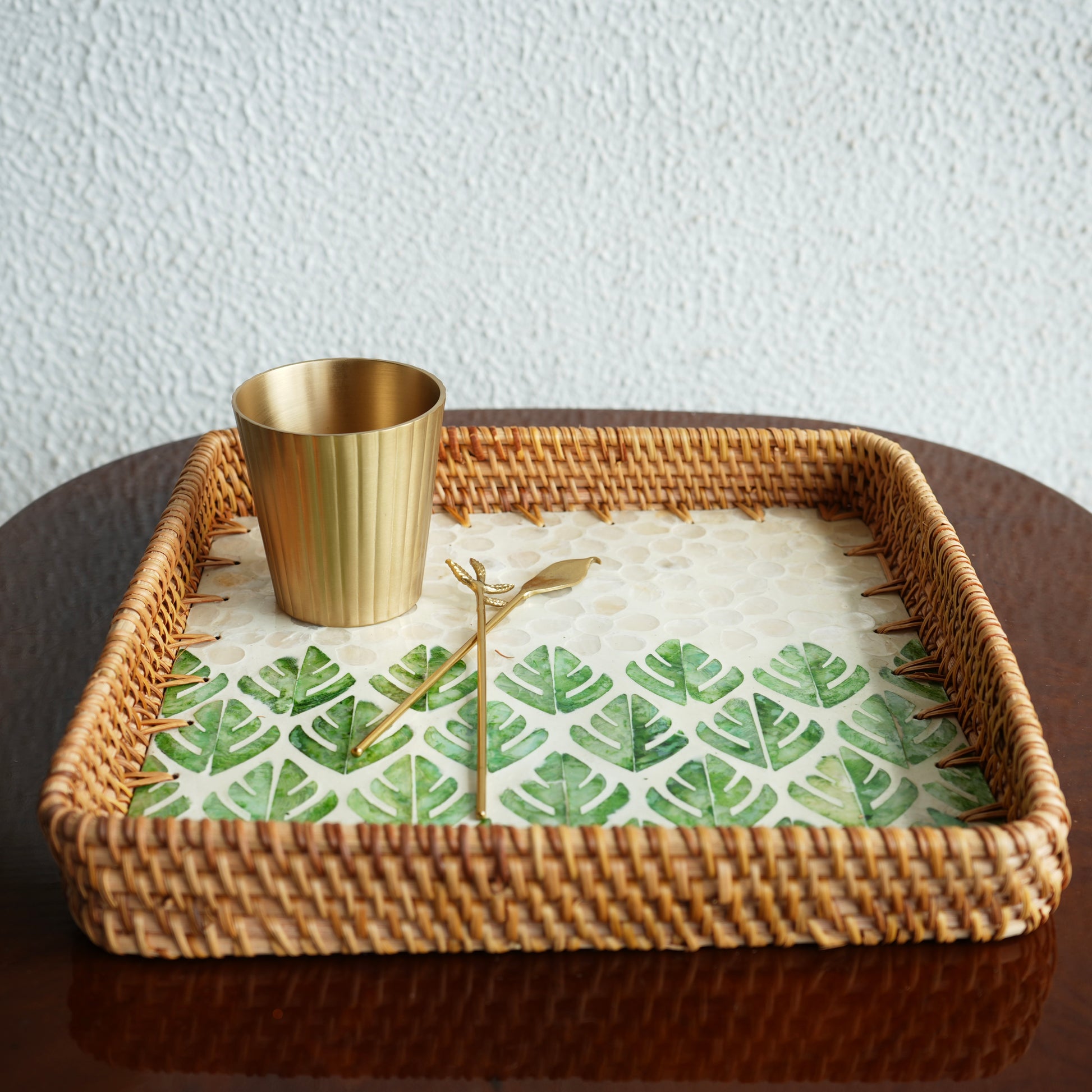 Large Square Mother-of-Pearl & Cane Serving Tray - Botanic