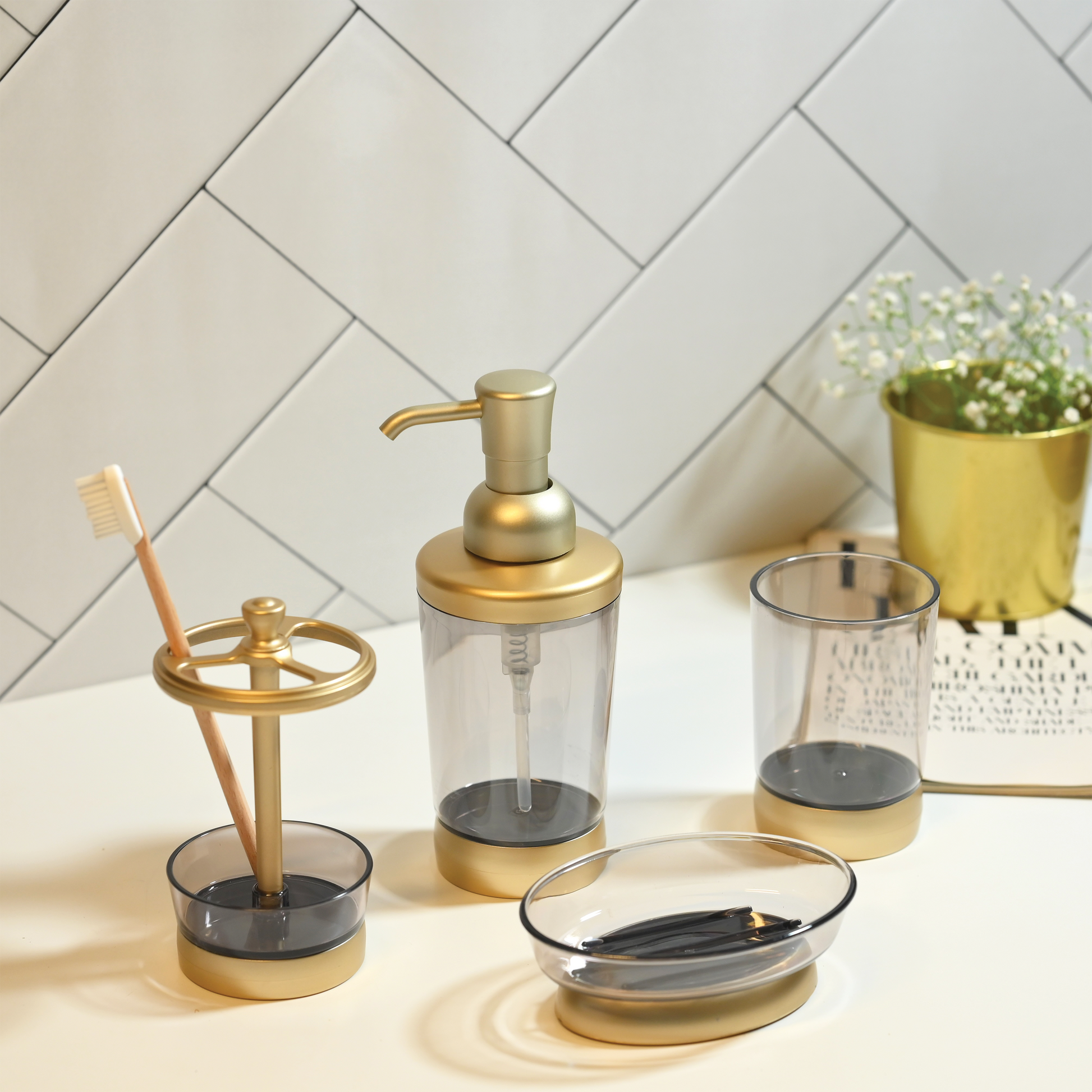 Add a touch of luxury to your bathroom with our Matte Gold Finish 4-Piece Bathroom Set. Featuring a clear body with a sleek matte gold finish, this set includes a dispenser, a toothbrush stands, a multi-purpose stand and a soap dish, perfectly blending modern elegance with practical functionality for a refined, stylish look.