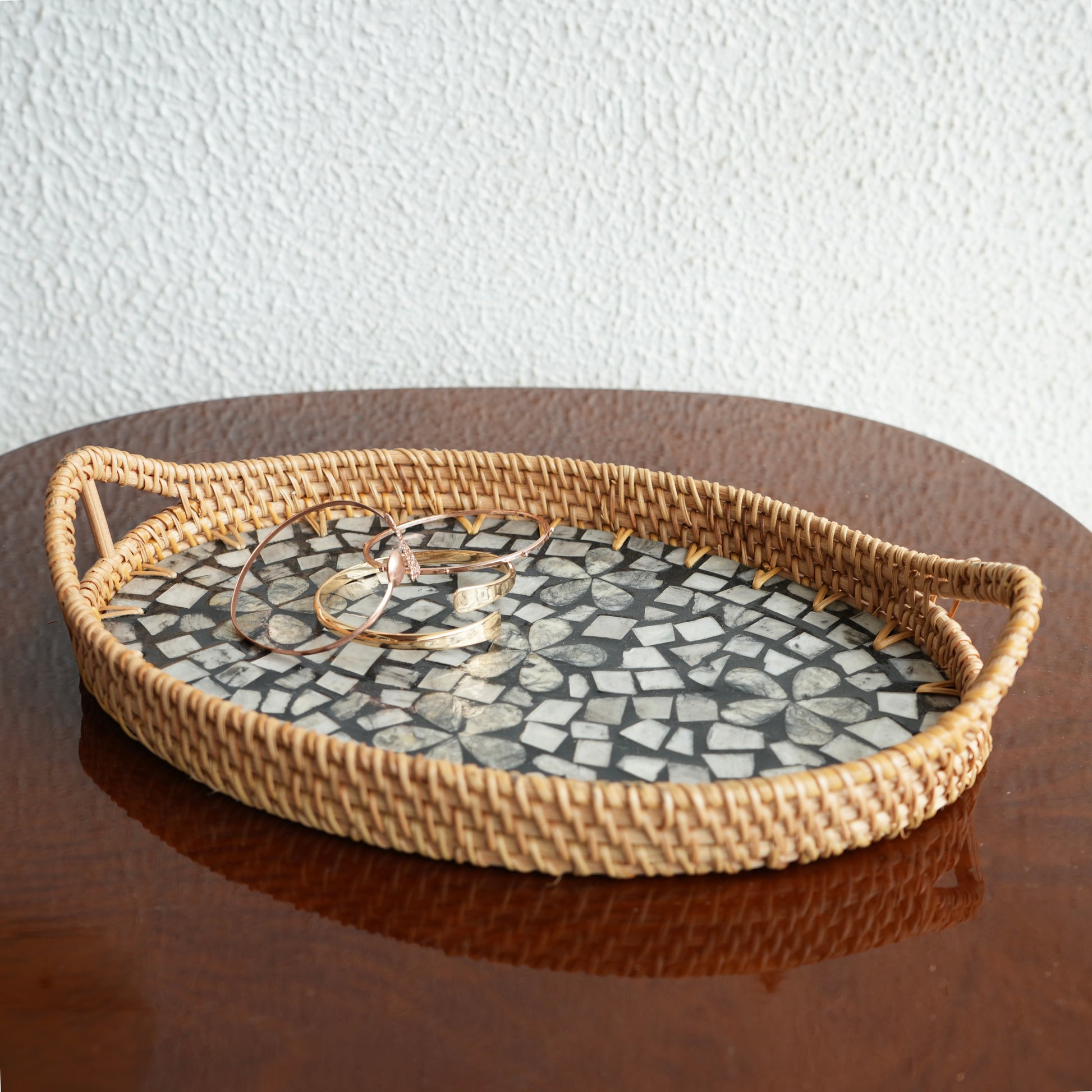 Elevate your hosting with our Oval Mother-of-Pearl & Cane Serving Tray, a stunning blend of