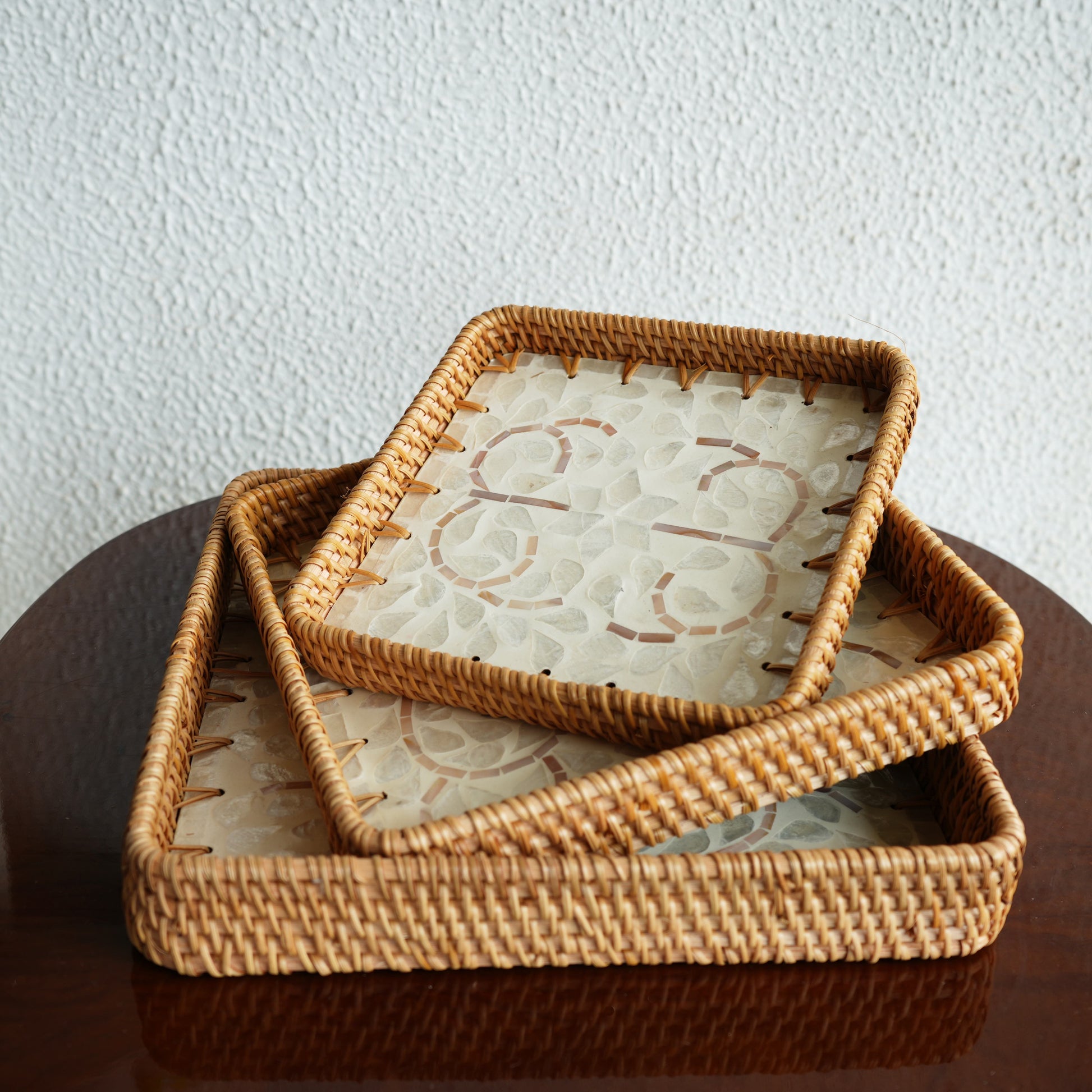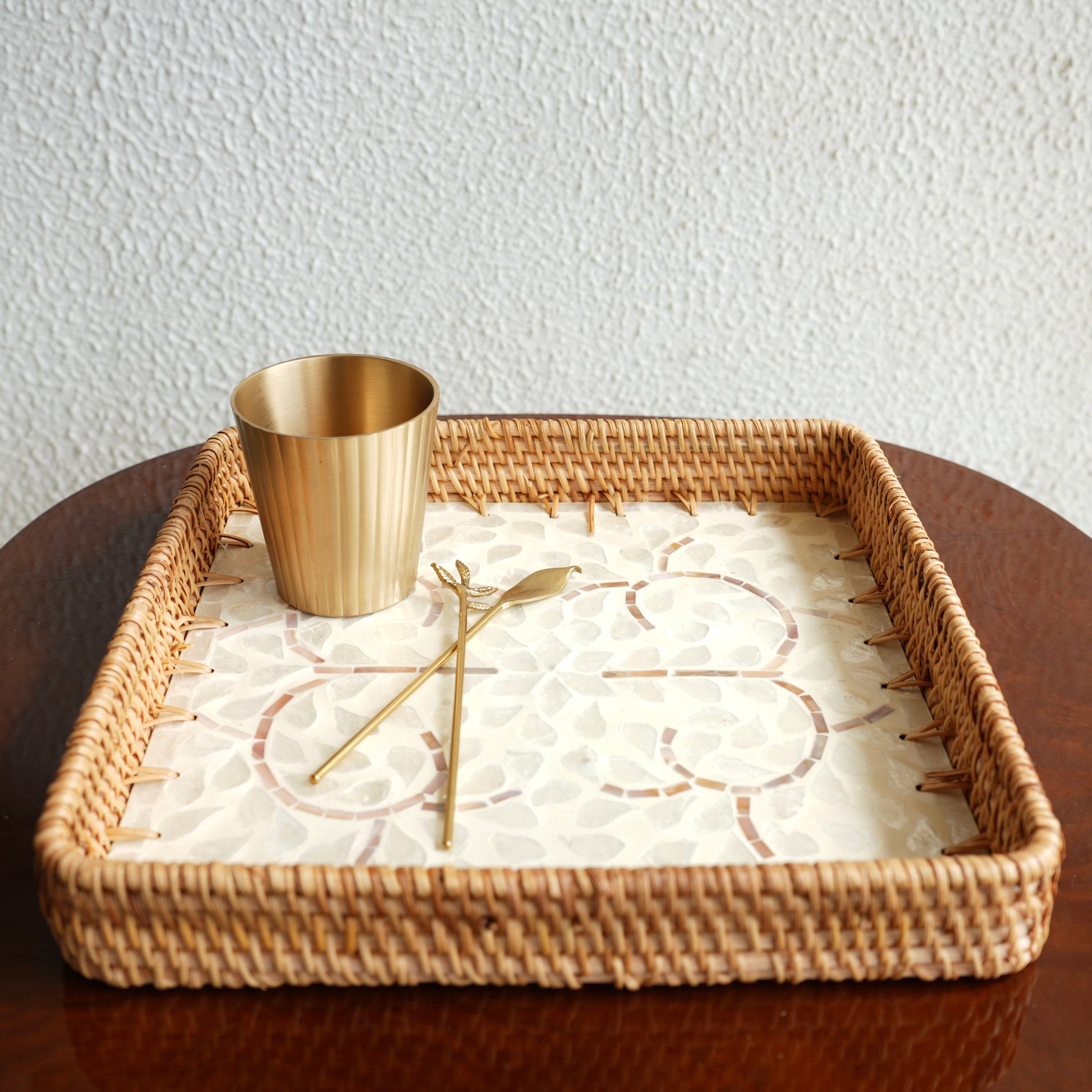 Elevate your hosting with our Rectangular Mother-of-Pearl & Cane Serving Tray, a stunning