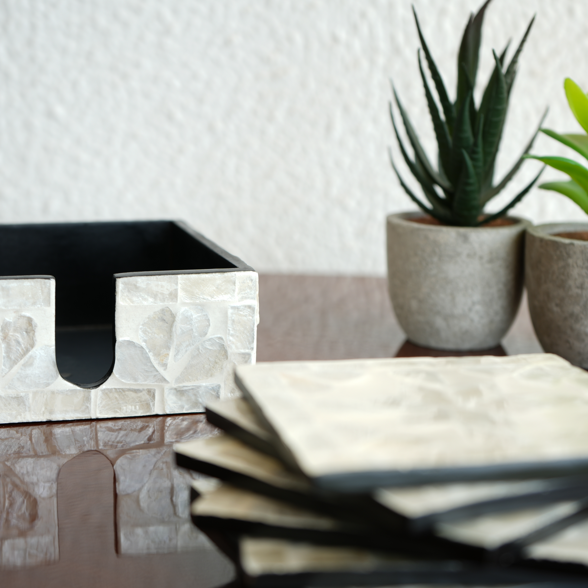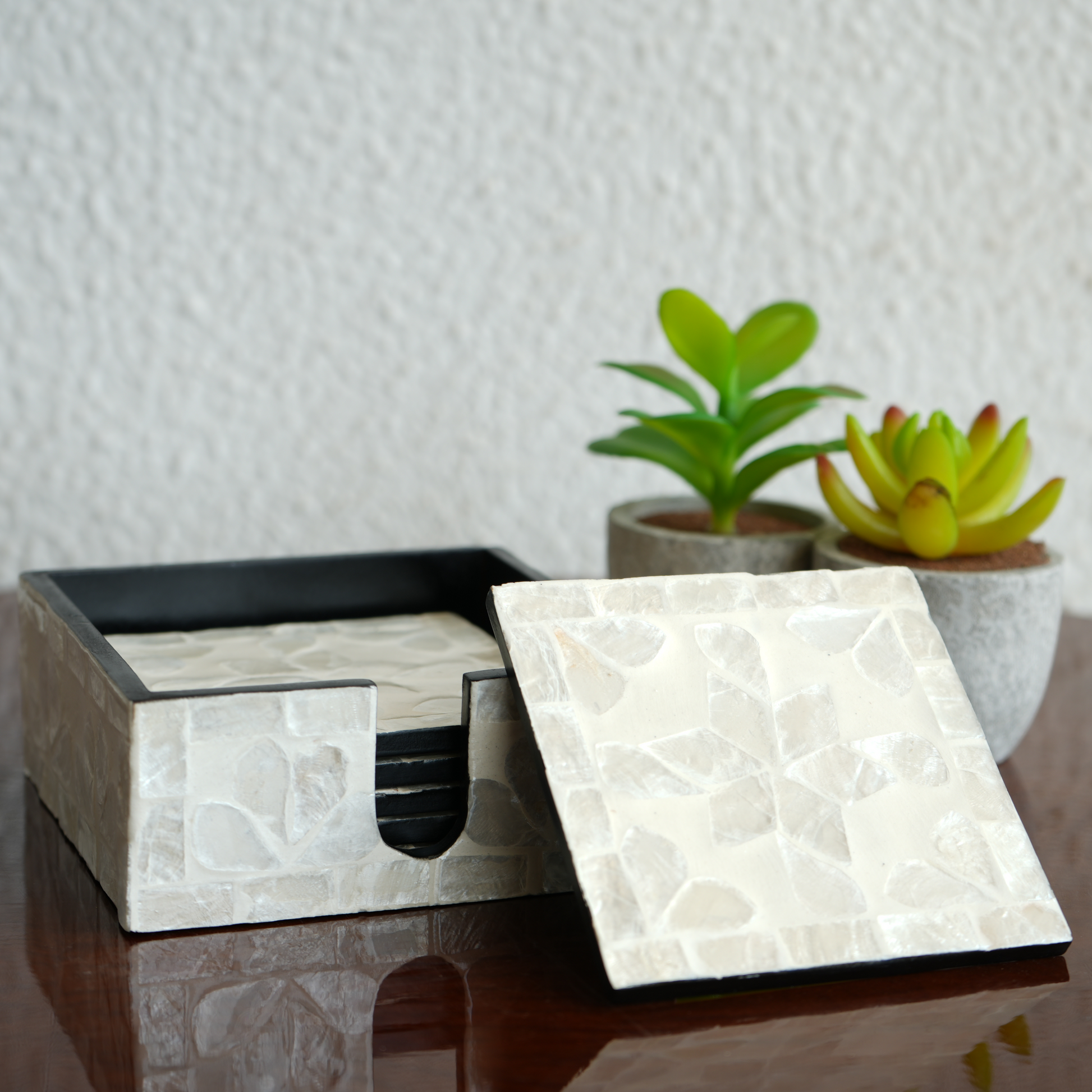 handcrafted with natural shell inlay, they protect surfaces while doubling as chic décor accents.