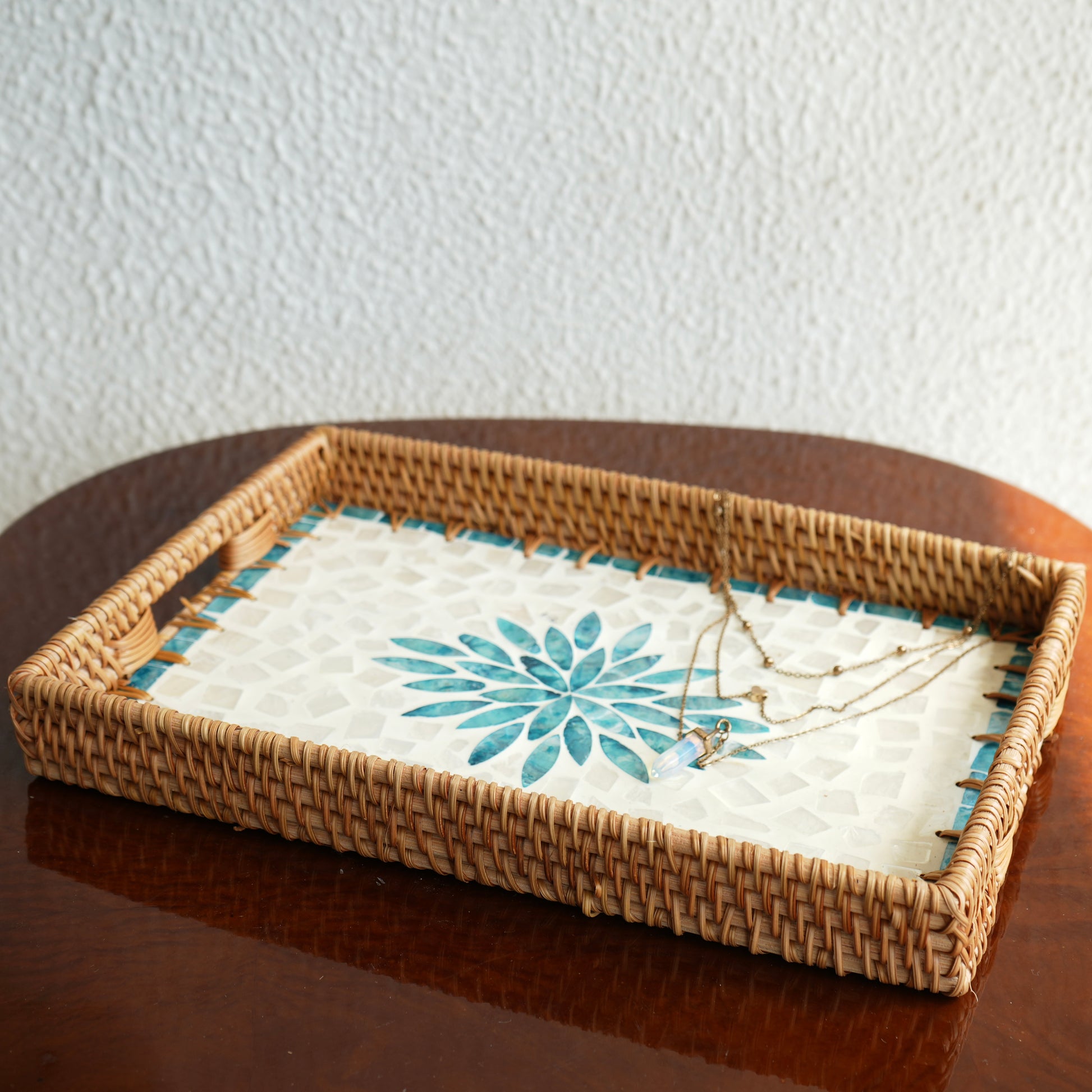 Regular Rectangular Mother-of-Pearl & Cane Serving Tray - Aqua