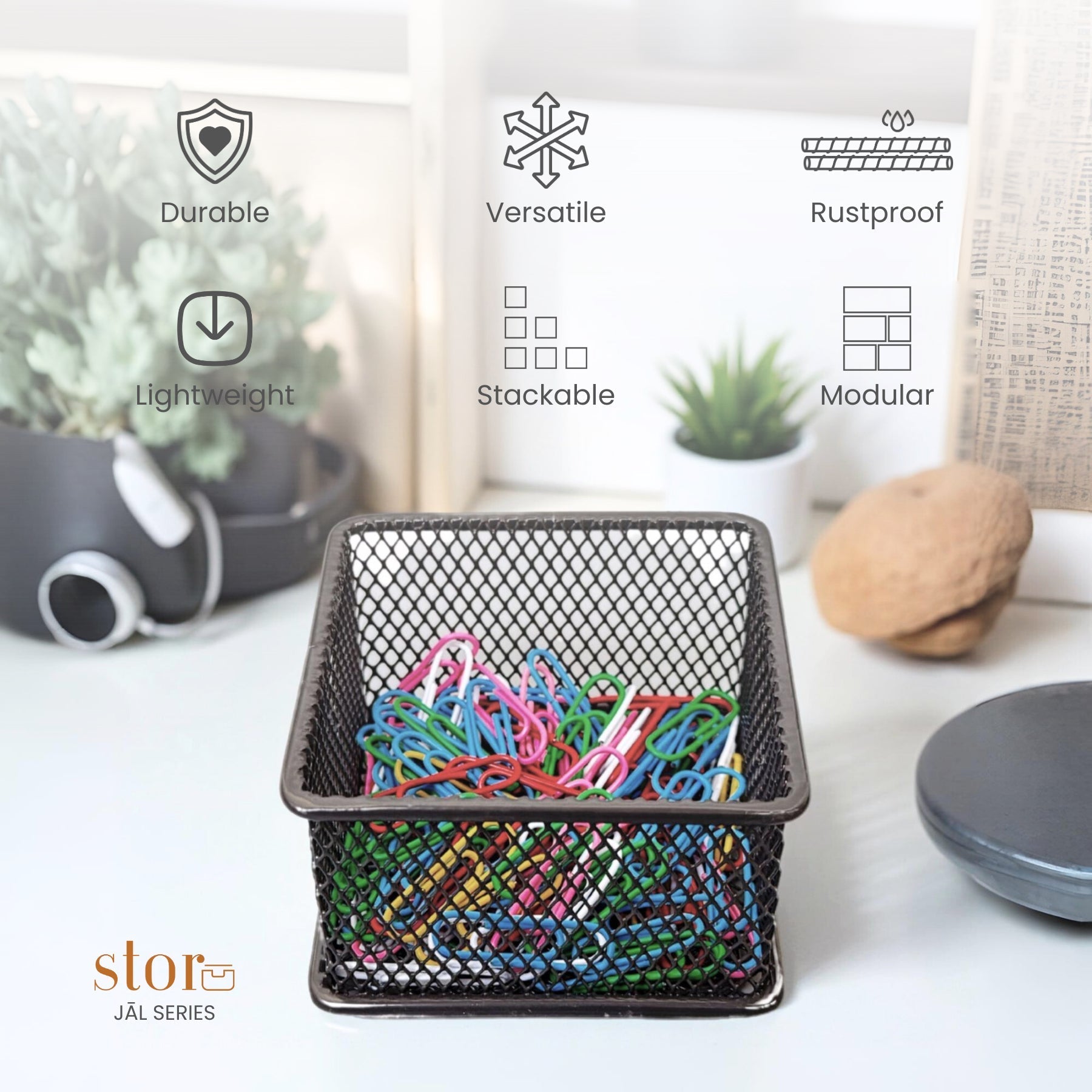 Maximise storage with our Stackable Mesh Storage Organiser, crafted from durable, powder-coated metal for a sleek and sturdy design. Its stackable structure helps optimize space, making it perfect for organizing office supplies, toiletries, kitchen essentials, and more. The open-mesh design ensures visibility and easy access, keeping your space tidy and efficient!