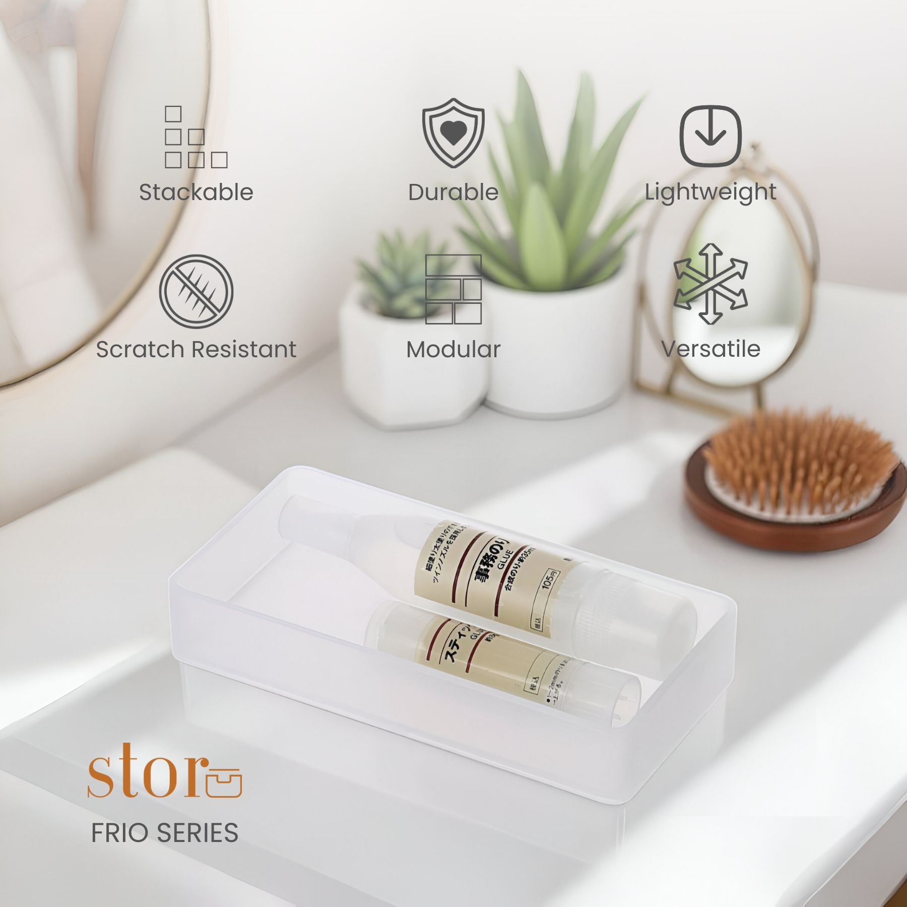 Declutter with ease using our Stackable Storage Organiser, crafted from durable, frosted white polypropylene for a sleek, modern look. Its modular, stackable design maximizes vertical space, making it perfect for closets, kitchens, offices, and bathrooms. Ideal for storing pantry items, toiletries, stationery, and more—keep everything organised and within reach!