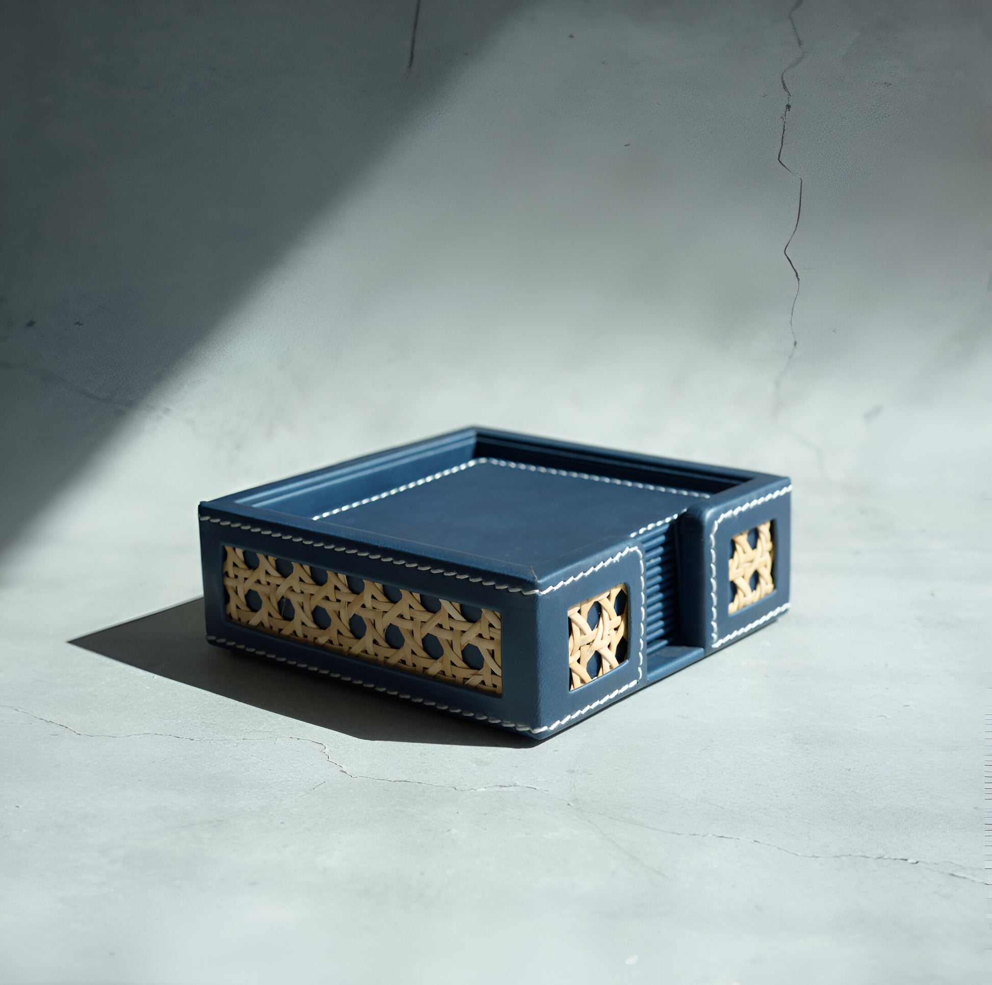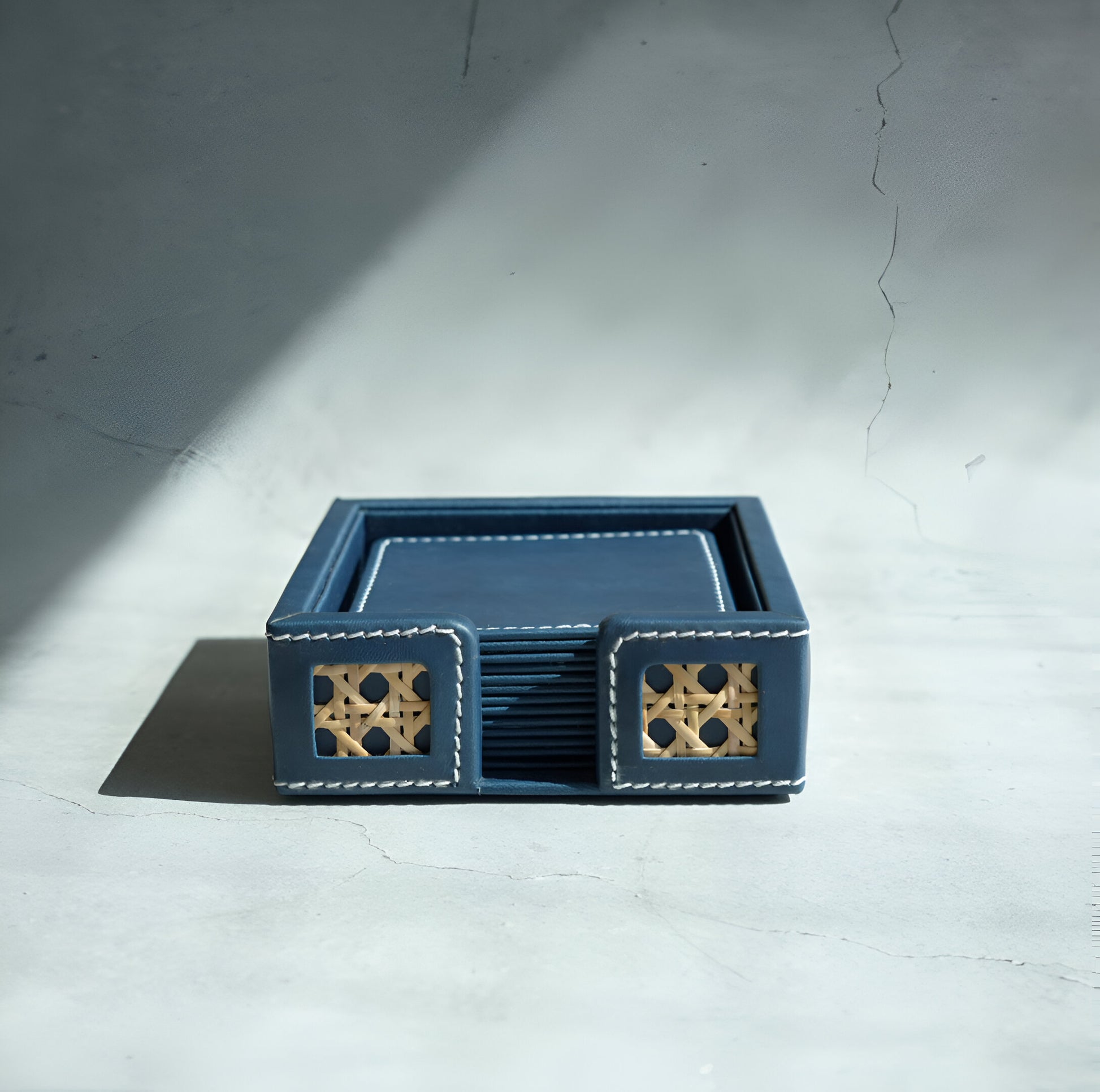 Steel Blue PU Leather & Rattan Coasters - Set of 6