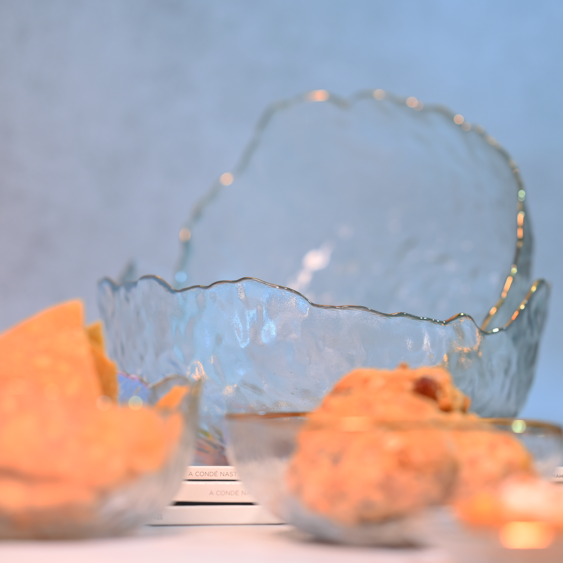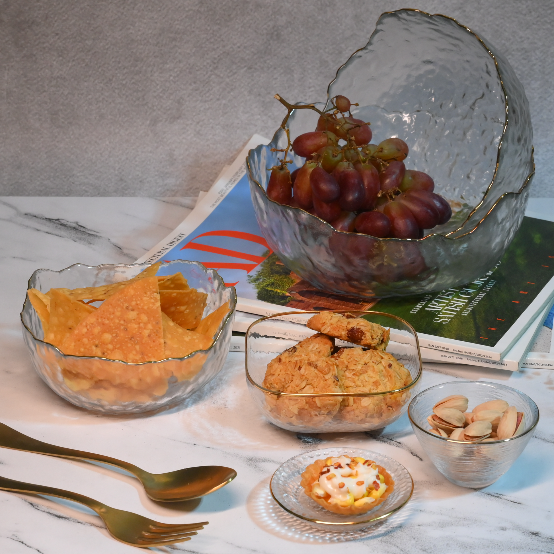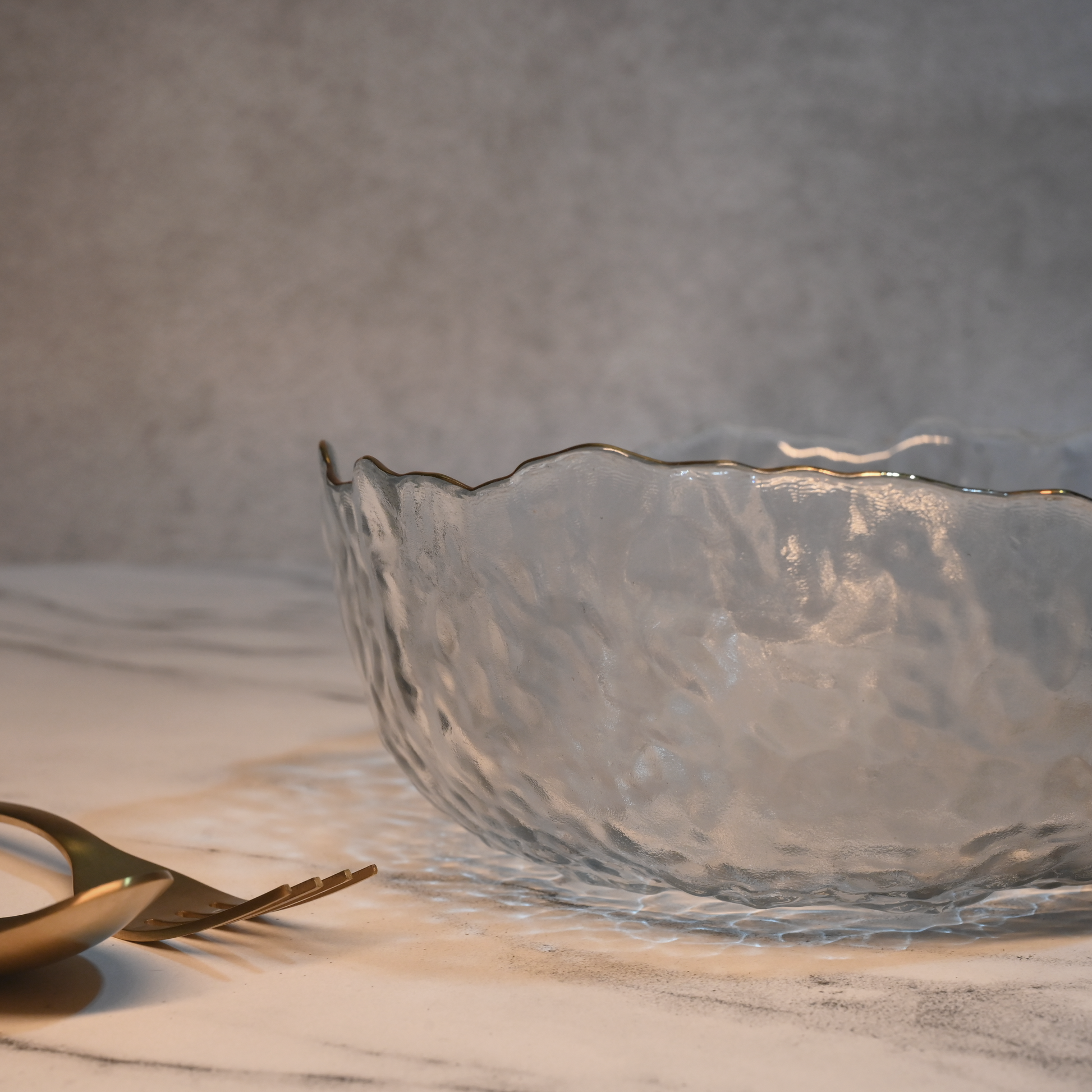 Add a touch of sophistication to your serveware with our Textured Glass Bowl with Gold Rim. Featuring an elegant textured design and a luxurious gold rim, this bowl is perfect for serving salads, desserts, or snacks, elevating your dining experience with style and grace.