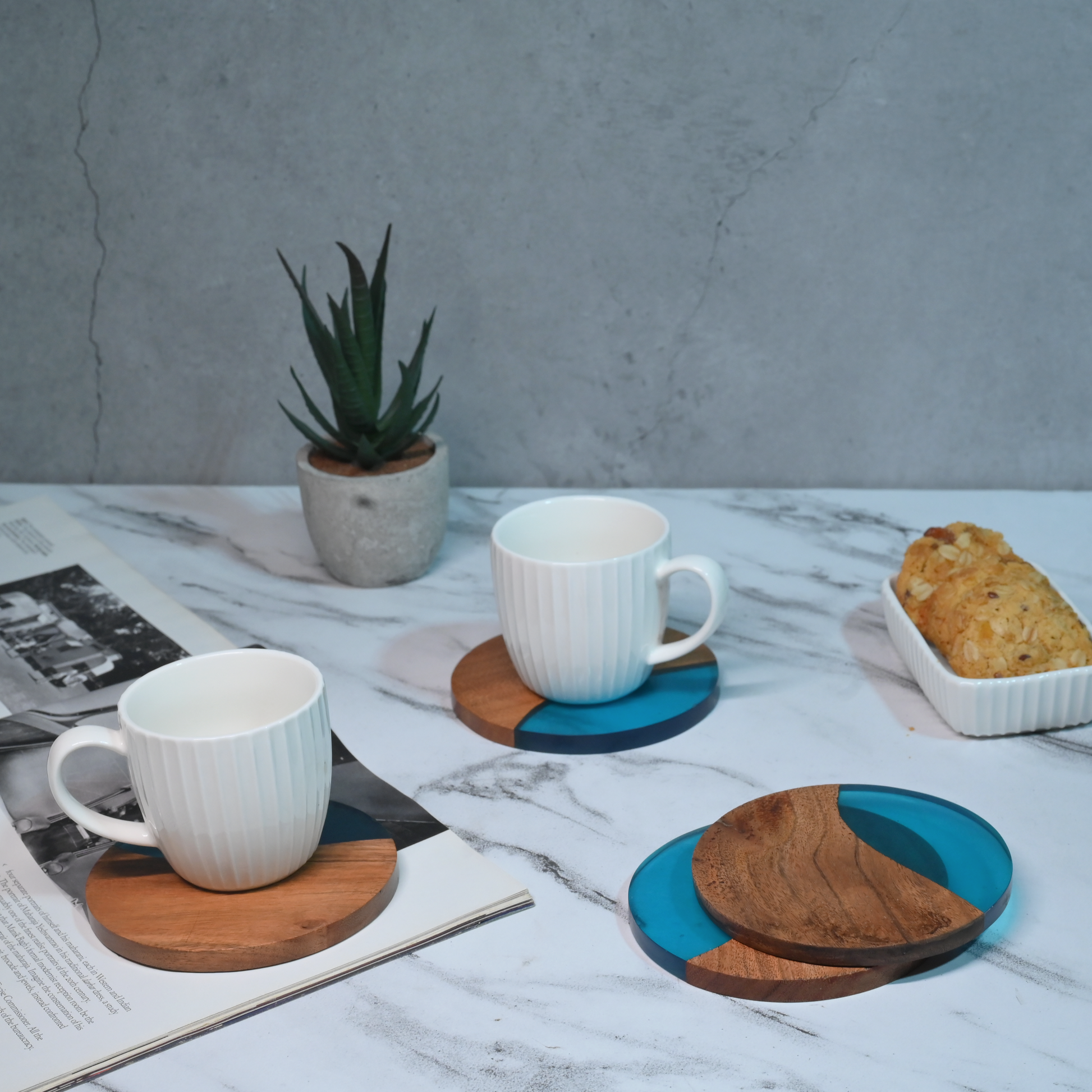 Add a pop of color to your table with our Turquoise Resin and Wooden Round Coasters. This handcrafted set of 4 features a stunning blend of natural wood and vibrant turquoise resin, perfect for protecting your surfaces while enhancing your decor with a modern touch.